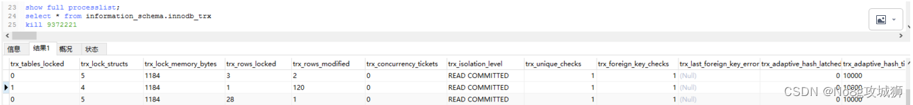 1、SELECT * FROM information_schema.INNODB_TRX; – 当前运行的所有事务