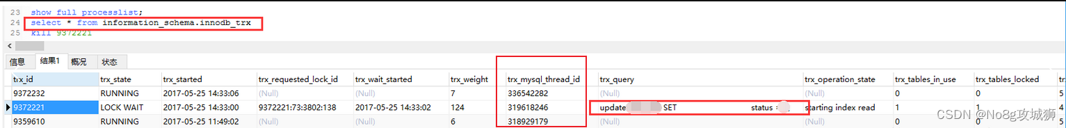 如果数据库中有锁的话,查看 innodb_trx就可以看到对应的信息。通过查询知道是哪条语句锁了,图中红色语句为占用系统资源的语句,我们需要杀掉这个锁,执行 kill 线程id号。上面这条记录的id为319618246 ,所以我们执行:kill 319618246即可。以下为执行前后对比:
